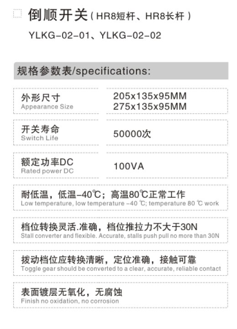 本倒顺开关广泛应用于电动汽车、电动快艇、电动三轮车、游乐设备等,控制车的前进或者倒车用,手感良好,牢固耐用。